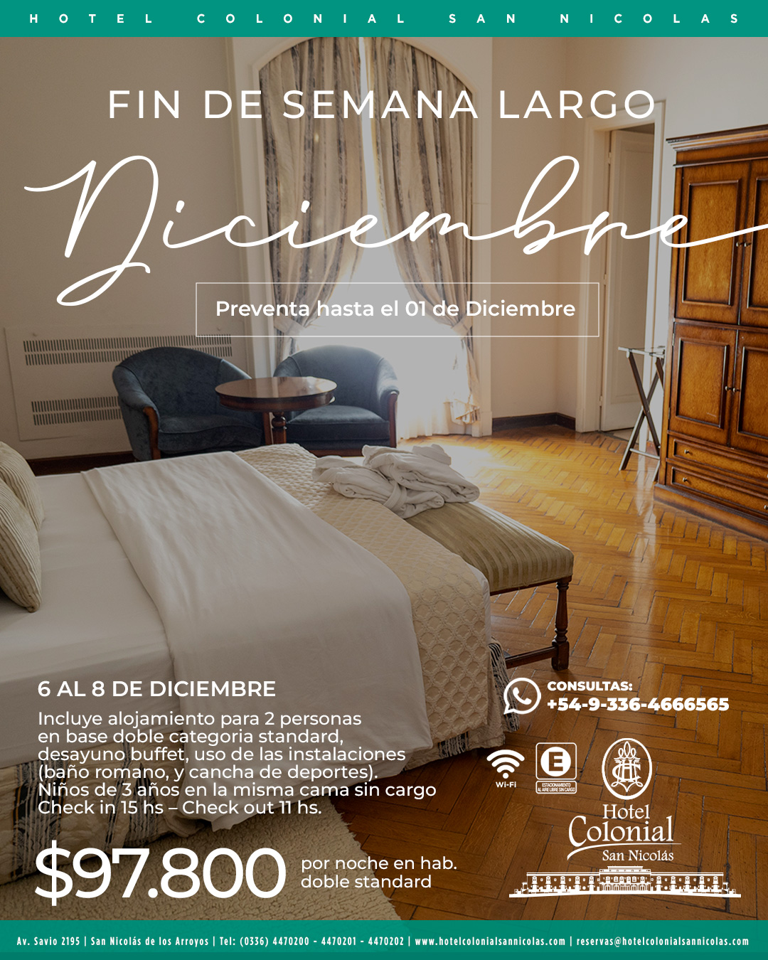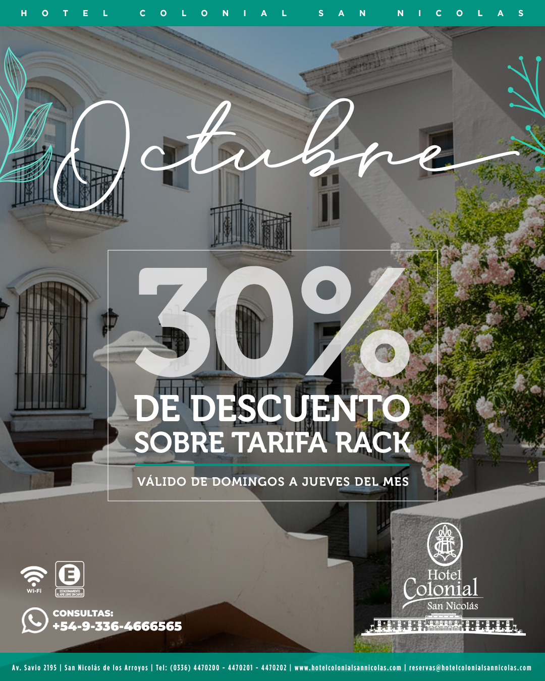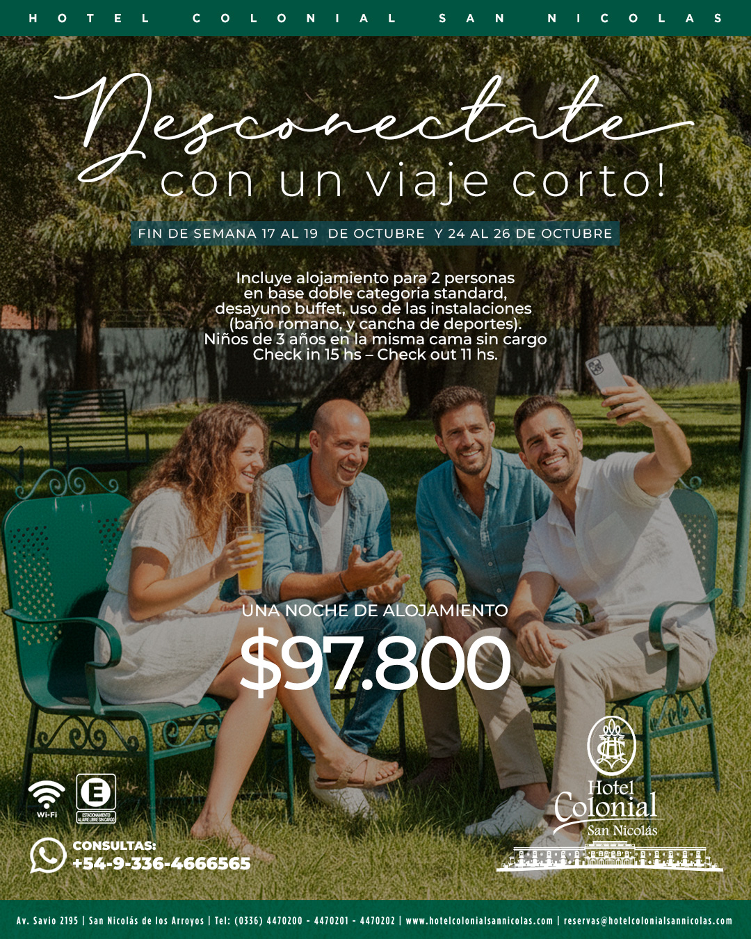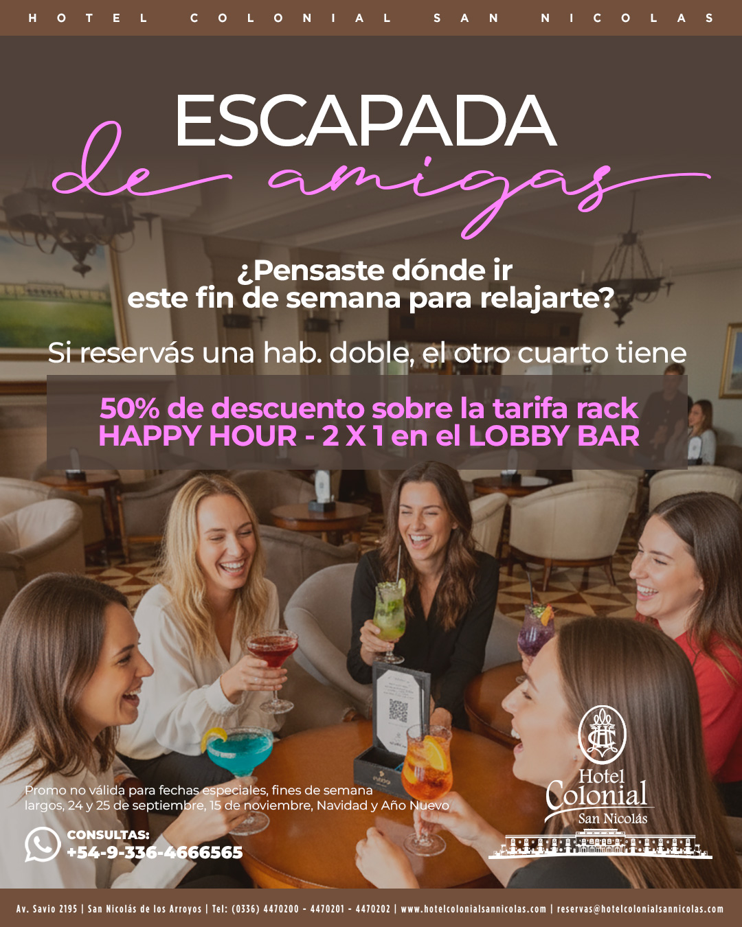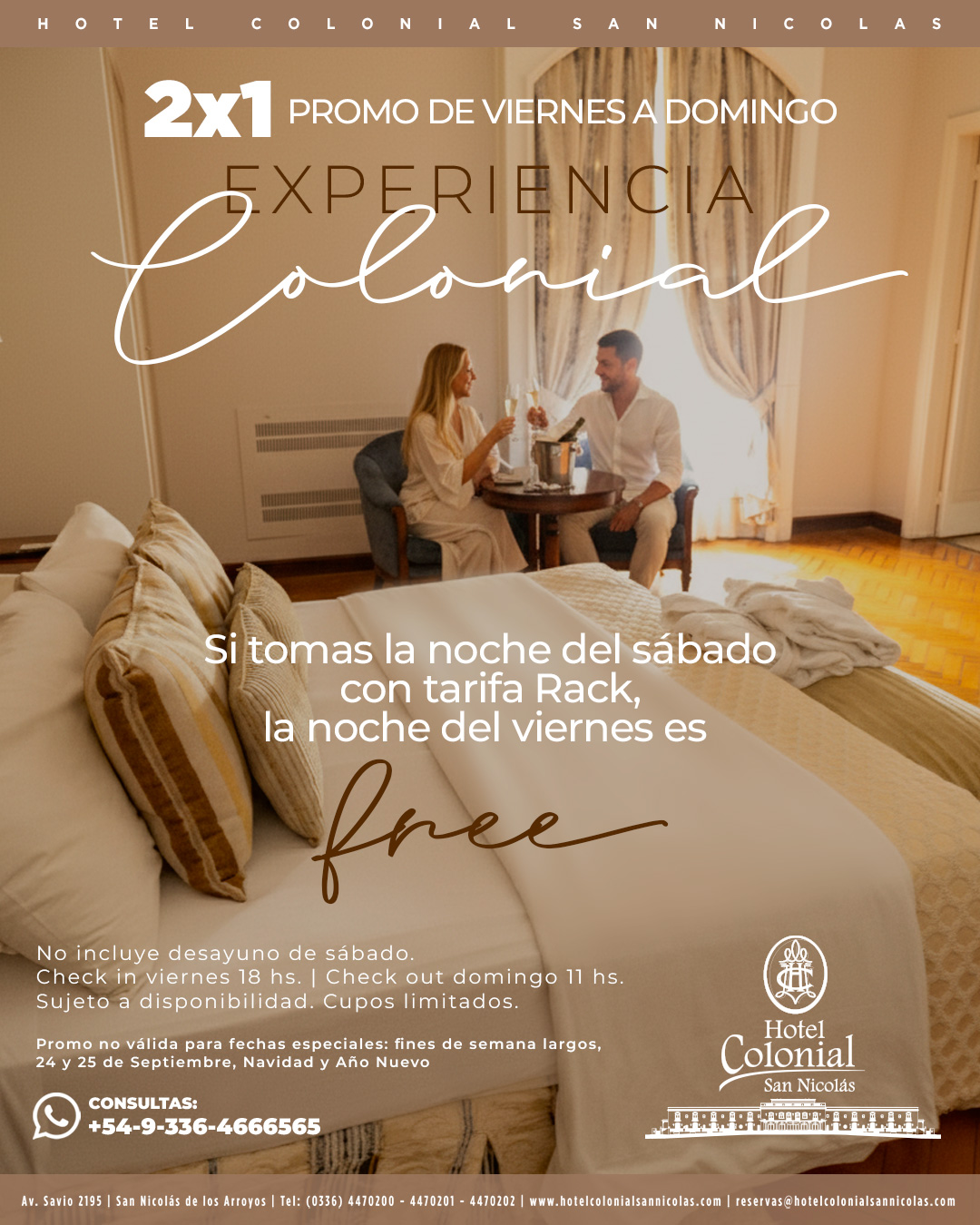 HOTEL COLONIAL SAN NICOLÁSUN LUGAR ÚNICO5,5 hectáreas de parqueEntorno de naturaleza 106 habitaciones y suitesPlacer y descanso Promociones Sorprendé a tus sentidos Salus Per Aquam Spa Horarios de atención:Viernes y Sábado de 12 a 20hs.Domingo 09 a 13hs.