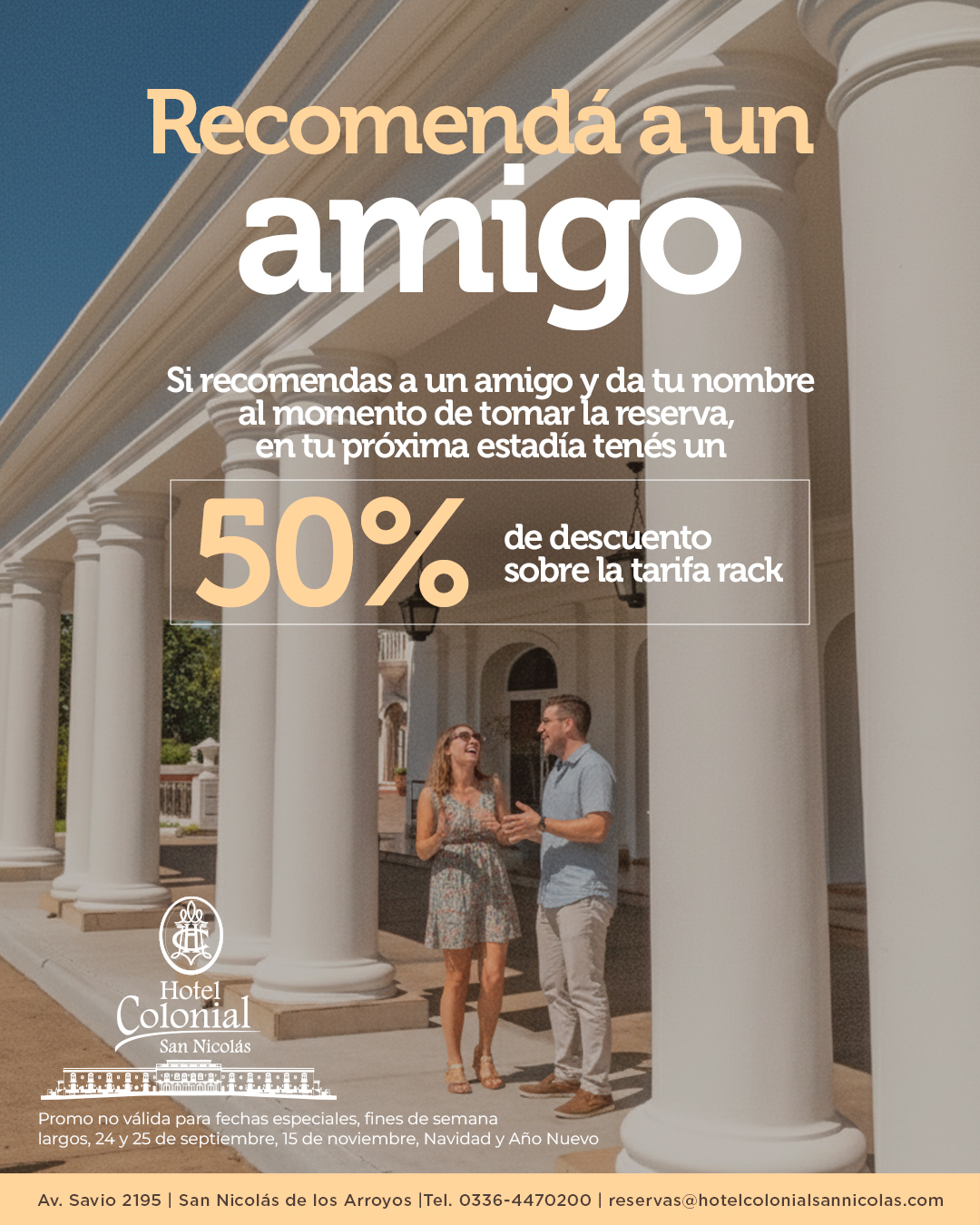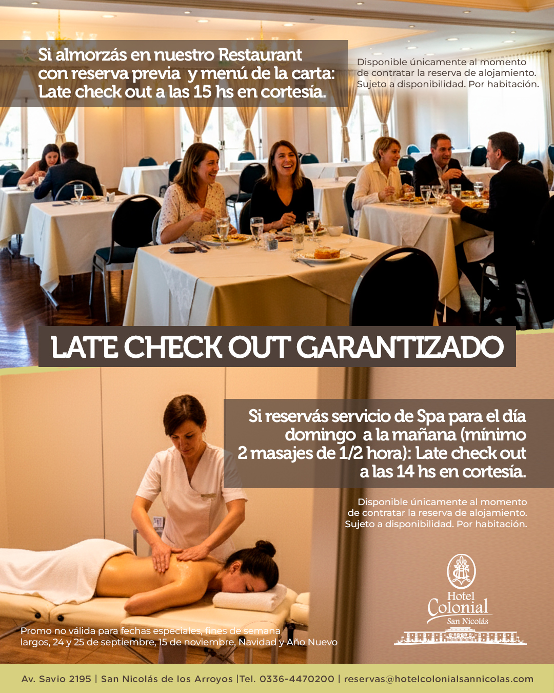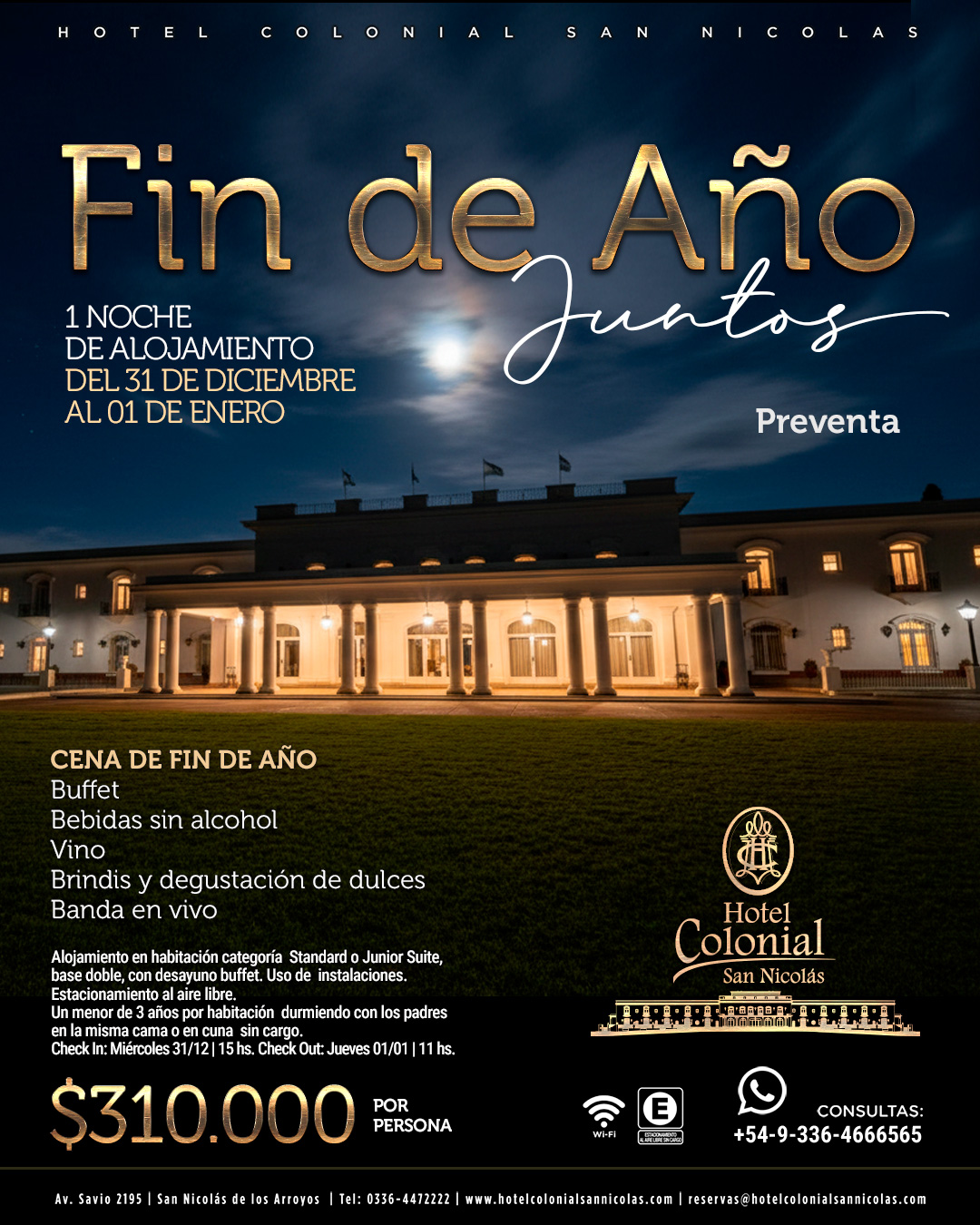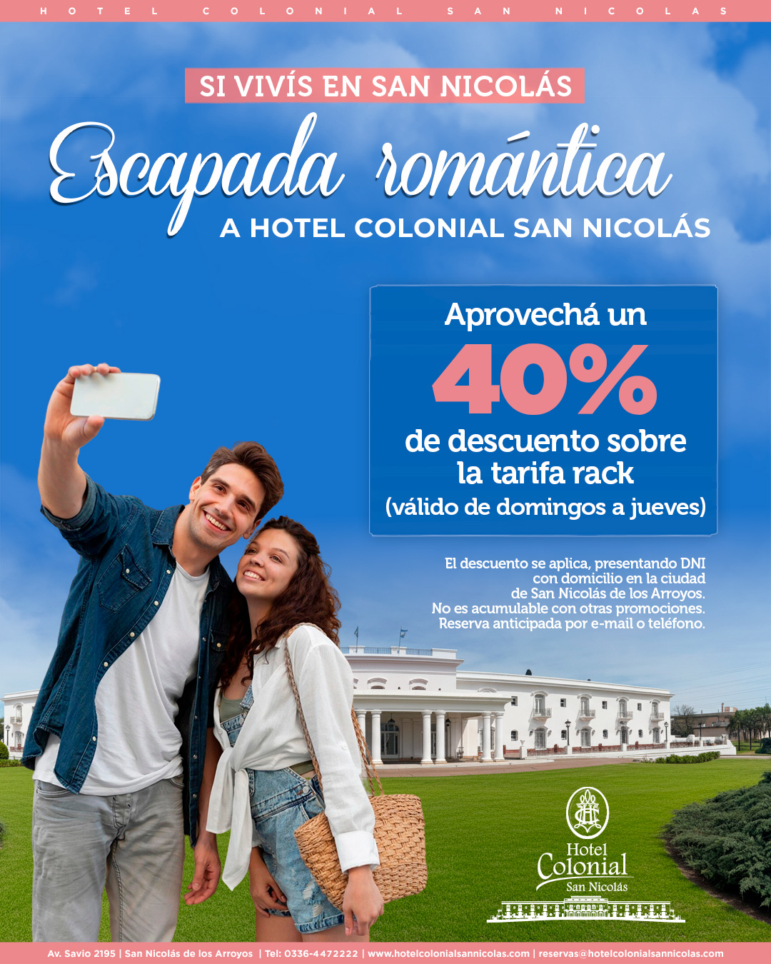 HOTEL COLONIAL SAN NICOLÁSUN LUGAR ÚNICO5,5 hectáreas de parqueEntorno de naturaleza 106 habitaciones y suitesPlacer y descanso Promociones Sorprendé a tus sentidos Salus Per Aquam Spa Horarios de atención:Viernes y Sábado de 12 a 20hs.Domingo 09 a 13hs.