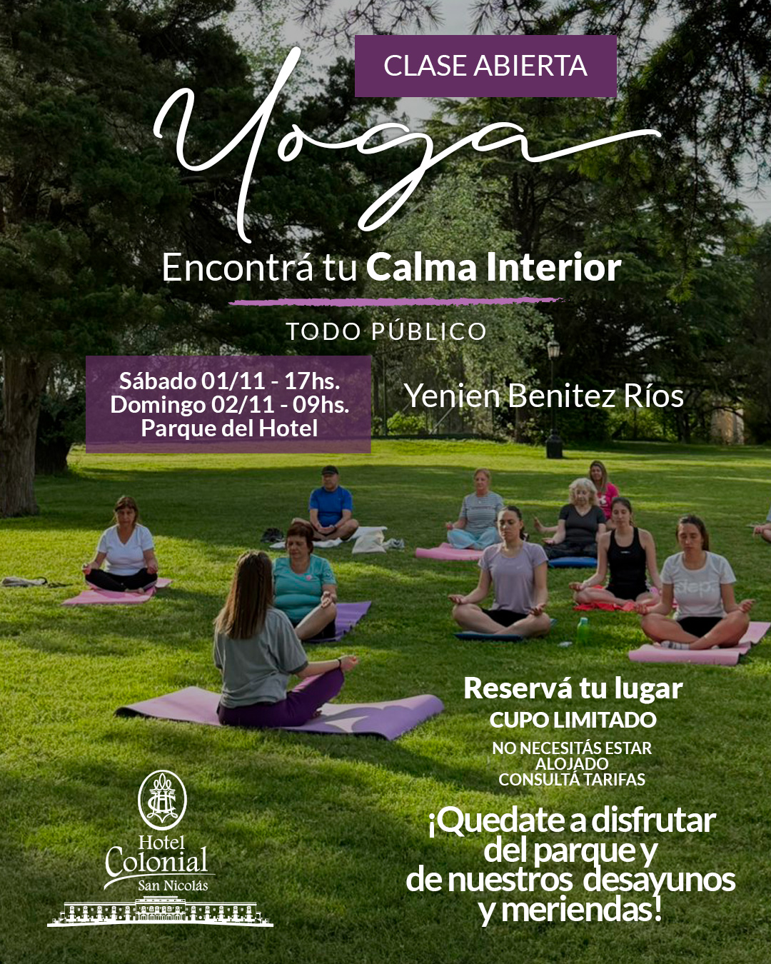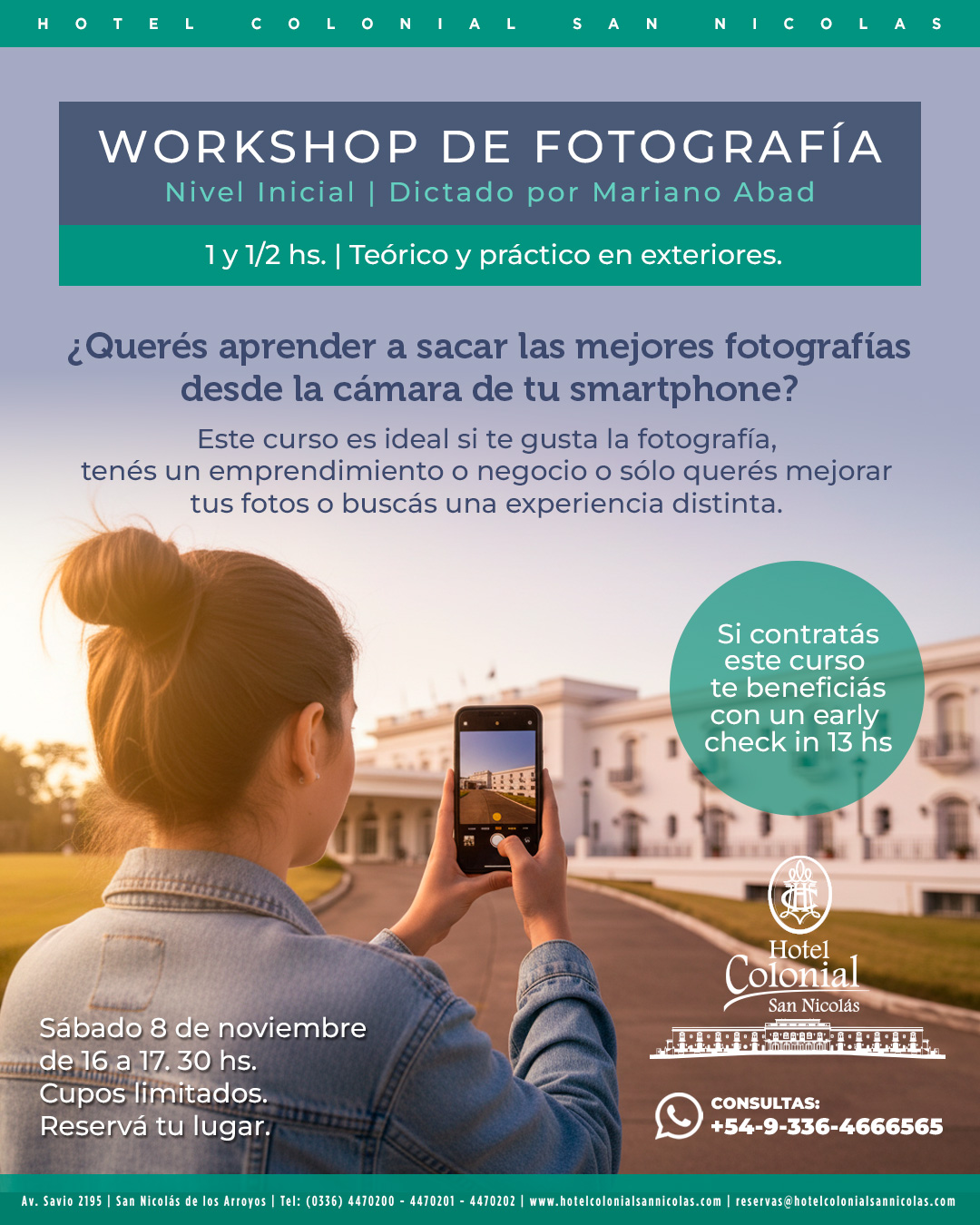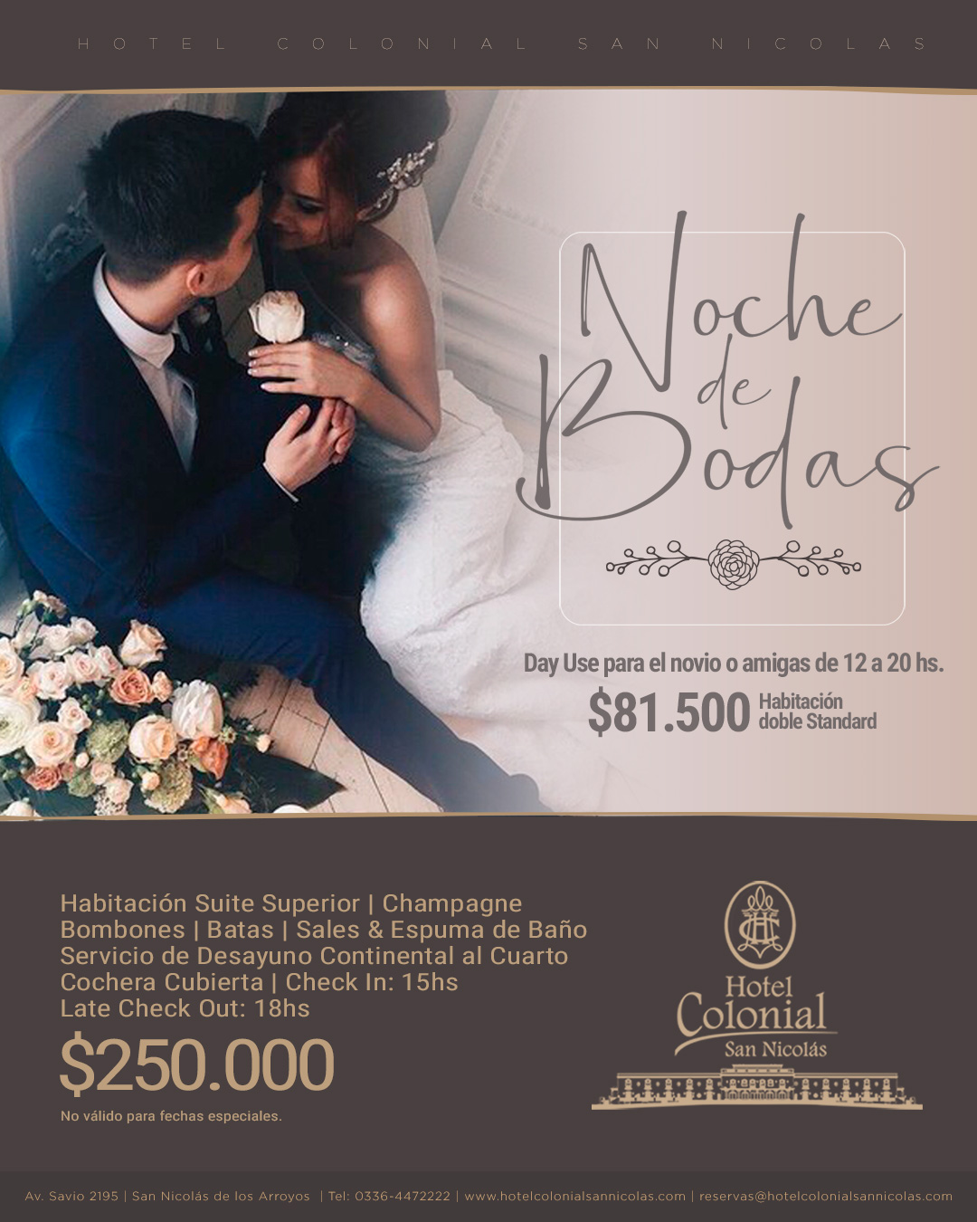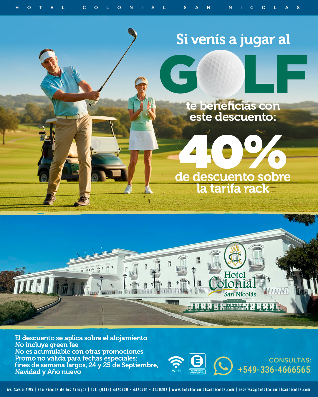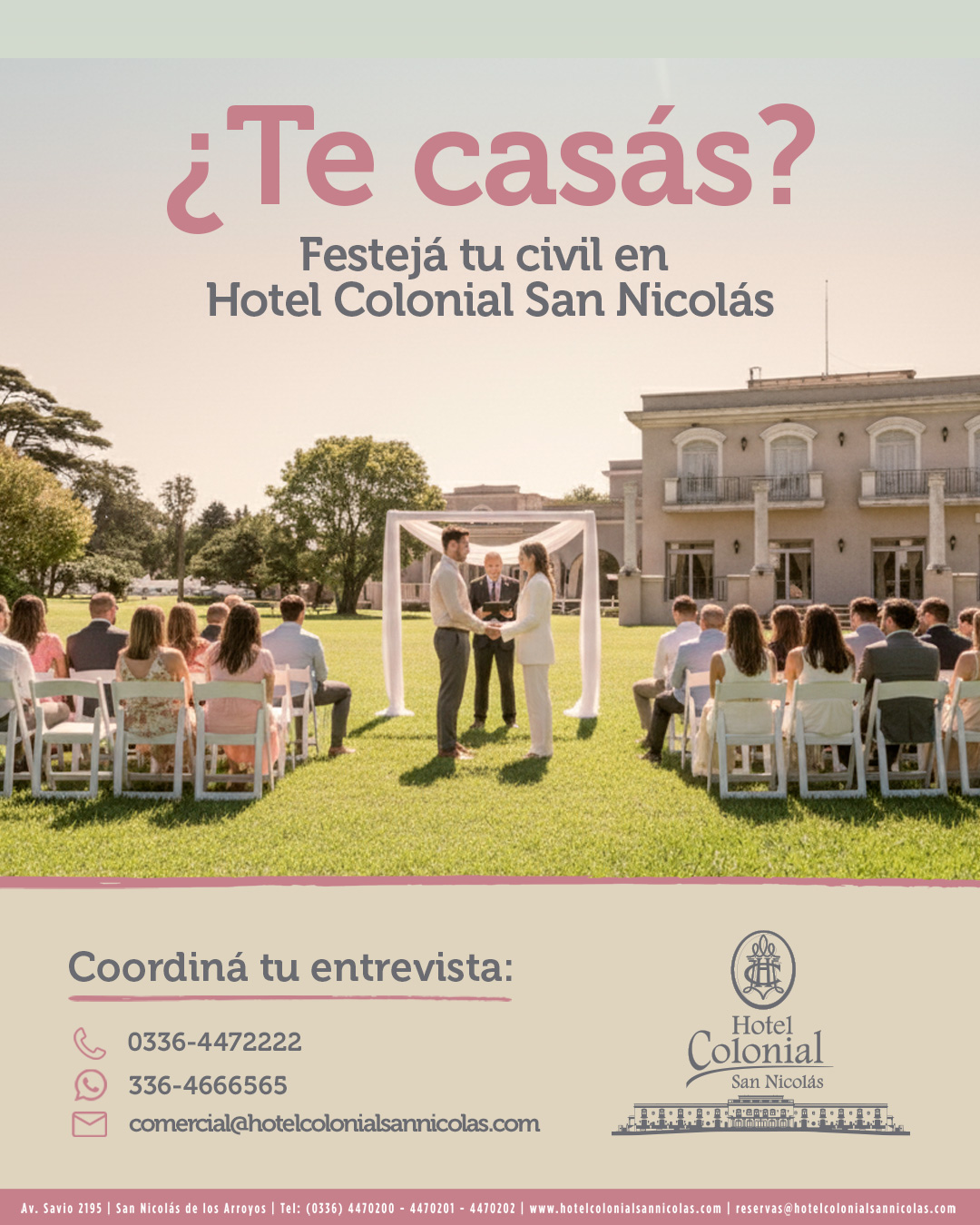 HOTEL COLONIAL SAN NICOLÁSUN LUGAR ÚNICO5,5 hectáreas de parqueEntorno de naturaleza 106 habitaciones y suitesPlacer y descanso Promociones Sorprendé a tus sentidos Salus Per Aquam Spa Horarios de atención:Viernes y Sábado de 12 a 20hs.Domingo 09 a 13hs.